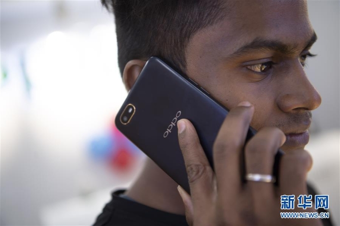 這是在印度金奈的一家商場,一名男子使用中國品牌OPPO的手機(2019年10月8日攝)。 新華社記者 呂小煒/攝