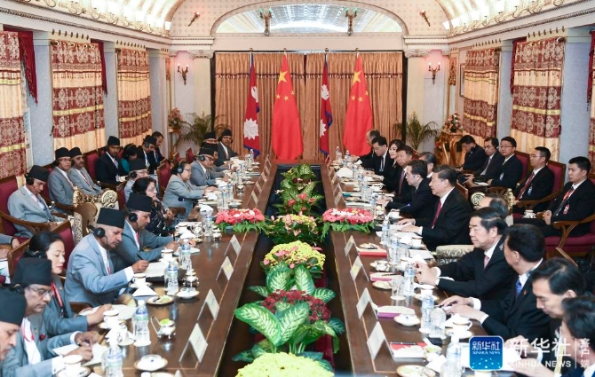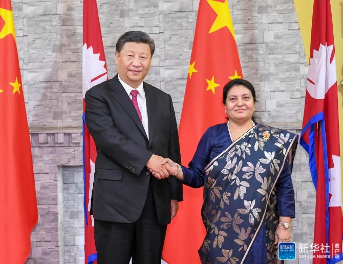 習近平指出,今年4月在北京,你盛情邀請我年內訪問尼泊爾。我今天如約而來。正如總統(tǒng)女士所說,中尼之間只有友好和合作。在機場和沿途歡迎人群的臉上,我看到了尼泊爾人民真誠的笑容,感受到了他們對中國人民發(fā)自內心的友好,讓我再次感受到中尼友好在尼泊爾擁有廣泛共識和扎實根基。中尼兩國人民心意相通、休戚與共,是鄰國友好交往的典范。我希望通過這次訪問,傳承中尼傳統(tǒng)友誼,順應兩國人民期待,推動兩國關系更上一層樓。