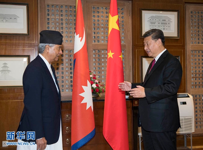 新華社加德滿都10月12日電 記者孫奕 南辰 國家主席習(xí)近平12日在加德滿都下榻飯店會(huì)見尼泊爾大會(huì)黨主席德烏帕。