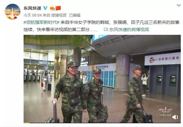 據(jù)中國人民解放軍火箭軍官方微博@東風(fēng)快遞 消息,火箭軍某部新兵營正迎來3名女新兵,她們是來自中華女子學(xué)院的韓鋮、張雅娟、田子凡。