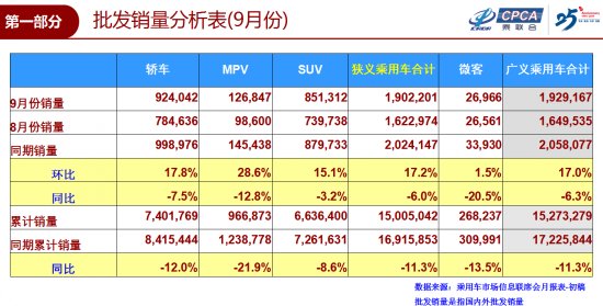 10月12日,乘用車市場信息聯(lián)席會發(fā)布數(shù)據(jù)顯示:9月,狹義乘用車銷量1781411輛,環(huán)比上升14.0%,同比下滑6.5%;1-9月,累計銷量14782417輛,同比下滑8.6%。9月同比增速稍好于8月增速和1-9月累計增速,由于基數(shù)因素同比降幅進一步收窄,終端消費逐步恢復,乘用車市場企穩(wěn)。
