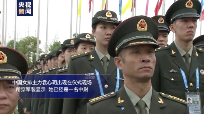 中國(guó)女排主力袁心玥出現(xiàn)在儀式現(xiàn)場(chǎng),所穿軍裝顯示,她已經(jīng)是一名中尉。在2016年巴西里約奧運(yùn)會(huì)上,袁心玥披上國(guó)家隊(duì)?wèi)?zhàn)袍出征,與隊(duì)友一起奪得奧運(yùn)冠軍。