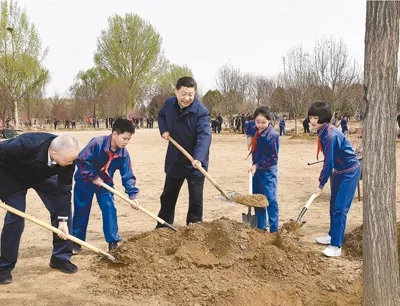 2019年4月,習(xí)近平總書記來到北京城市副中心綠心城市森林公園參加首都義務(wù)植樹活動(dòng)。他一邊勞動(dòng),一邊向身邊的少先隊(duì)員詢問學(xué)習(xí)生活和體育鍛煉情況,祝他們像小樹苗一樣茁壯成長(zhǎng)。