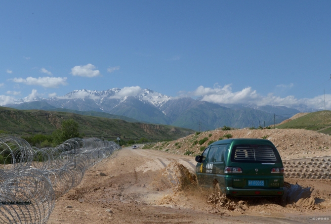郵車行駛在新疆伊犁霍爾果斯崎嶇的盤山路上。