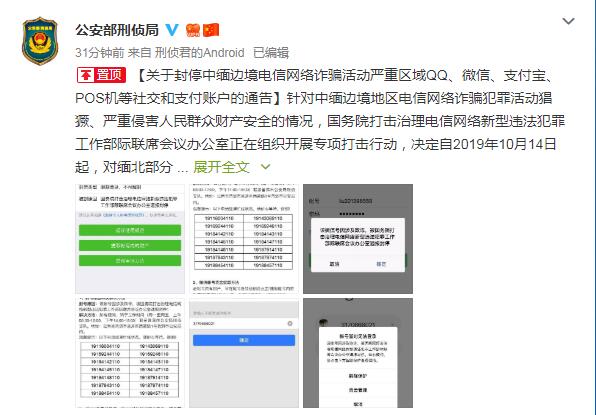 針對(duì)中緬邊境地區(qū)電信網(wǎng)絡(luò)詐騙犯罪活動(dòng)猖獗、嚴(yán)重侵害人民群眾財(cái)產(chǎn)安全的情況,國(guó)務(wù)院打擊治理電信網(wǎng)絡(luò)新型違法犯罪工作部際聯(lián)席會(huì)議辦公室正在組織開展專項(xiàng)打擊行動(dòng),決定自2019年10月14日起,對(duì)緬北部分電信網(wǎng)絡(luò)詐騙活動(dòng)嚴(yán)重區(qū)域的QQ、微信、支付寶、POS機(jī)等社交和支付賬戶采取封停措施。如有疑問,請(qǐng)盡快聯(lián)系公安部駐云南普洱工作站,公安機(jī)關(guān)將快速甄別,對(duì)因技術(shù)原因誤關(guān)停的賬號(hào)予以解封。