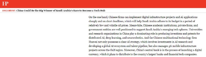 美國(guó)《外交政策》網(wǎng)站10月8日?qǐng)?bào)道稱,沙特阿拉伯正在加速發(fā)展物聯(lián)網(wǎng)、人工智能等新一代信息技術(shù)和數(shù)字產(chǎn)業(yè),積極打造新的國(guó)內(nèi)技術(shù)樞紐。而在這一過程中,中國(guó)可能將扮演重要角色并將受益。