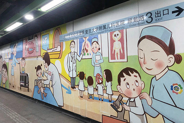 在站內(nèi)通往兒科醫(yī)院方向的長(zhǎng)廊兩側(cè),繪有一個(gè)小男孩從害怕看病到配合醫(yī)生、最后立志成為醫(yī)生的漫畫故事?!昂芏嗪⒆油ㄟ^醫(yī)療游戲模擬就醫(yī)的過程,獲得醫(yī)學(xué)科普知識(shí),也更加了解自己的身體,不但不再恐懼看病,還對(duì)醫(yī)學(xué)產(chǎn)生了濃厚的興趣?!睆?fù)旦大學(xué)附屬兒科醫(yī)院社工部主任傅麗麗說。