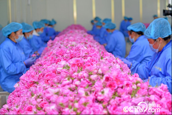 在四川省冒水村金山玫瑰精深加工廠,工人們一大早就開始挑選花朵,為產(chǎn)品加工做好第一道工序。