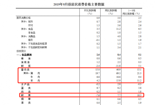 從數(shù)據(jù)看,在鮮菜價(jià)格已經(jīng)下降、鮮果價(jià)格同比上漲幅度不大的情況下,畜肉類價(jià)格“漲勢”較猛,帶動(dòng)物價(jià)指數(shù)的上升。