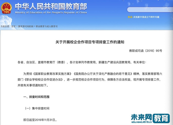 《通知》明確,即日起至2019年11月30日開展排查,排查范圍包含區(qū)域內(nèi)職業(yè)院校與企業(yè)開展的校企合作項(xiàng)目、簽訂的校企合作協(xié)議;地方各級(jí)教育行政部門正在實(shí)施的涉及校企合作的文件、制度、協(xié)議、備忘錄等。