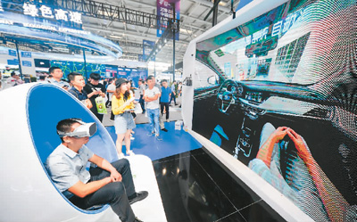 2019中國國際智能產業(yè)博覽會上,在東贏恒康控股集團展臺,一名參觀者通過VR體驗無人駕駛汽車自動入庫停車。新華社 記者劉潺/攝