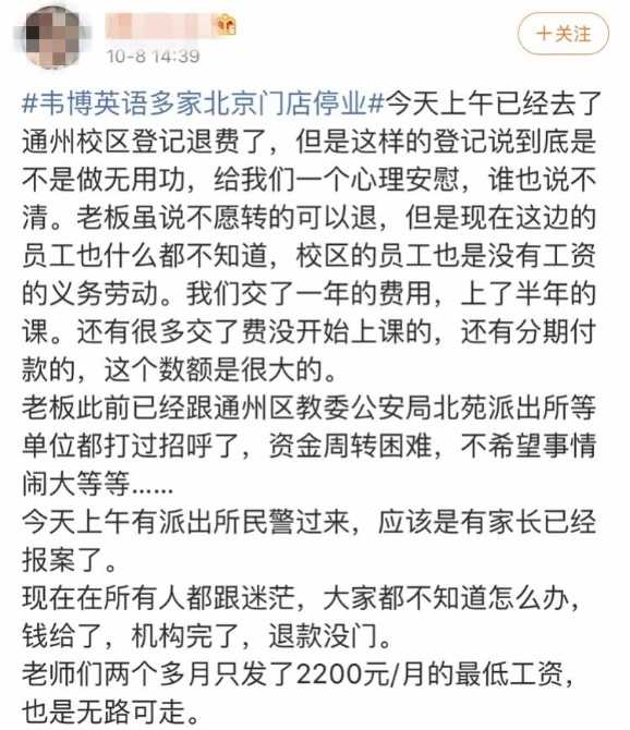 近日,韋博英語被曝在全國多地區(qū)大面積關(guān)停,北京6個校區(qū)停止運(yùn)營且被曝拖欠員工工資,學(xué)員退款也是一拖再拖。而更令人憂心的是,不少學(xué)員為了支付五位數(shù)的課程費(fèi)用,通過韋博英語向金融機(jī)構(gòu)進(jìn)行了教育分期貸款,無論韋博英語是否退款這些學(xué)員都只能還貸,否則就要上征信。