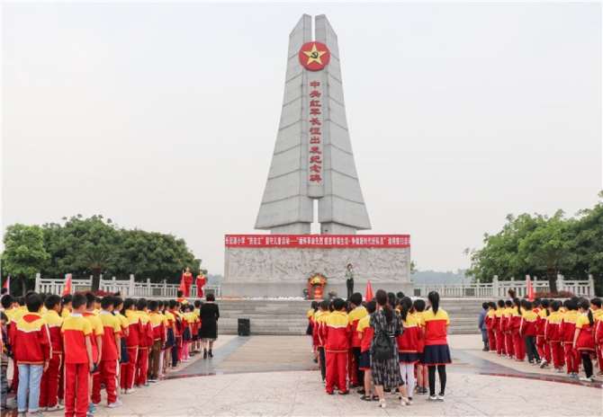 長征源小學(xué)師生在江西于都中央紅軍長征出發(fā)紀(jì)念碑前參加清明祭掃活動(2018年4月4日攝)。新華社發(fā)(長征源小學(xué)供圖)