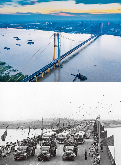 橋梁連接五湖四海,見證歷史滄桑。新中國成立以來,一座座中國橋記錄了發(fā)展奇跡。武漢長江大橋是新中國成立后修建的第一座公路和鐵路兩用的長江大橋,素有“萬里長江第一橋”美譽(yù)。今天,中國橋梁建設(shè)已經(jīng)達(dá)到世界領(lǐng)先水平,中國橋享譽(yù)世界。上圖為楊泗港長江大橋,這已是武漢第十座長江大橋,也是世界最大跨度雙層懸索橋,該橋于2019年9月21日通車運(yùn)營(中新社發(fā) 趙廣亮/攝)。下圖為1957年10月15日,披綢掛彩的汽車隊(duì)在萬眾歡呼聲中駛過武漢長江大橋(新華社記者 李九齡/攝)。