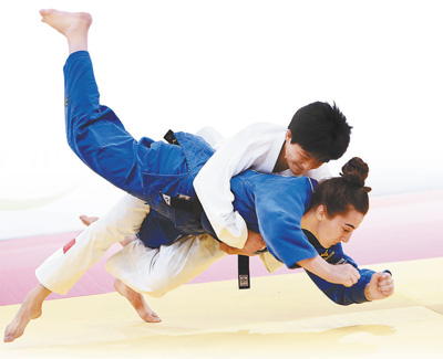 19日,唐婧(上)在比賽中。在柔道項(xiàng)目女子63公斤級(jí)決賽中,唐婧擊敗俄羅斯選手巴杜羅娃奪冠。 |