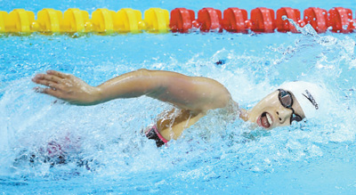 19日,楊浚瑄在比賽中。在女子4×100米混合泳接力決賽中,中國(guó)隊(duì)奪冠。 |