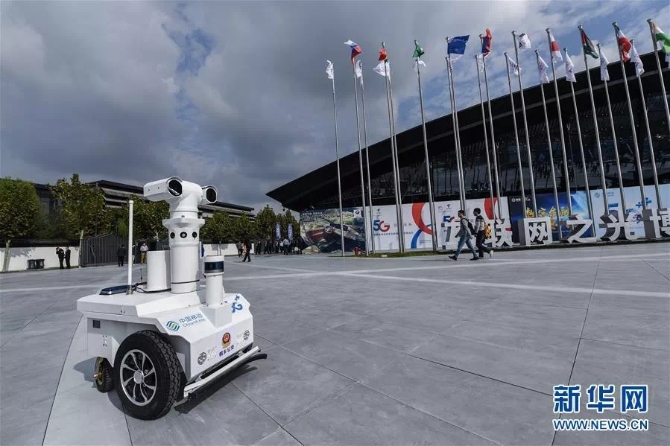 10月18日,這是互聯(lián)網(wǎng)之光博覽會(huì)外巡邏的5G警用機(jī)器人。新華社記者 徐昱 攝