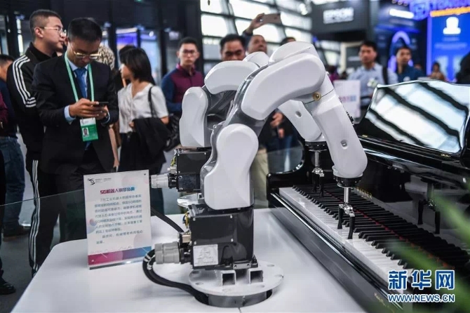 10月18日,這是互聯(lián)網(wǎng)之光博覽會(huì)現(xiàn)場(chǎng)展示的能彈鋼琴的5G機(jī)器人。新華社記者 徐昱 攝
