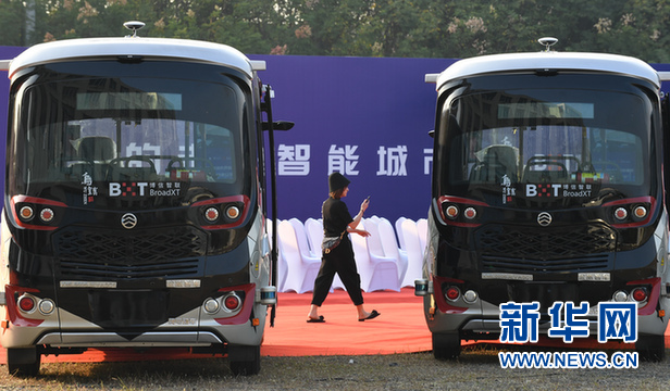 這是10月19日在烏鎮(zhèn)城市開放道路“5G自動微公交”示范線路開通剪彩儀式上拍攝的“5G自動微公交”。新華社記者 尹棟遜/攝