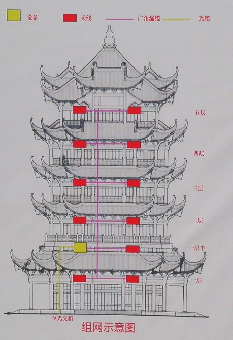 在黃鶴樓內(nèi),通信設(shè)備被藏在了各層樓天花板的“夾層”中,游客在外觀上根本看不到。