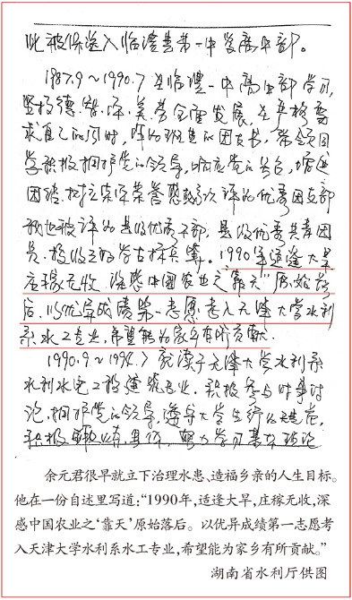 1972年,余元君出生于湖南臨澧縣洞庭湖畔的一戶農(nóng)民家庭。少年時(shí)代,他親身經(jīng)歷過洞庭湖洪澇水患的兇險(xiǎn),目睹了湖區(qū)群眾久旱失收的無助,立下治理水患、造福鄉(xiāng)親的人生目標(biāo)。在一份自述材料里,他寫道:“在澧水河畔,我悄悄地有了一個(gè)關(guān)于水的夢(mèng)想”,“1990年,適逢大旱,莊稼無收,深感中國(guó)農(nóng)業(yè)之‘靠天’原始落后。以優(yōu)異成績(jī)第一志愿考入天津大學(xué)水利系水工專業(yè),希望能為家鄉(xiāng)有所貢獻(xiàn)”。大學(xué)期間,余元君刻苦學(xué)習(xí),在結(jié)構(gòu)力學(xué)、水力學(xué)、水力機(jī)械等專業(yè)課程上,均取得95分以上的出眾成績(jī)??飚厴I(yè)時(shí),他對(duì)鼓勵(lì)并資助自己讀大學(xué)的初中老師說:“老師,您希望我走出窮山溝,外面的世界也真的很精彩,但家鄉(xiāng)還是老樣子,我要回家鄉(xiāng)工作?!?994年大學(xué)畢業(yè)時(shí),他進(jìn)入湖南省水利系統(tǒng),從此與洞庭湖生死相依。