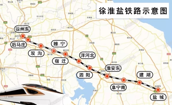 徐淮鹽鐵路西起徐州,東至鹽城,全線共設(shè)10個車站,設(shè)計時速250公里。