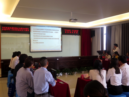 雨花街道黨建聯(lián)盟“不忘初心、牢記使命”黨務(wù)知識(shí)競(jìng)賽現(xiàn)場(chǎng)。