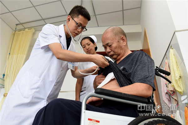 2019年9月7日,南和縣中醫(yī)院醫(yī)養(yǎng)中心醫(yī)護(hù)人員為老人檢查身體。(新華社記者 朱旭東 攝)
