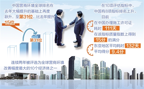 例如,在施工許可證辦理方面。目前,在中國(guó)辦理施工許可證耗時(shí)111天,在該指標(biāo)質(zhì)量指數(shù)上得到15分的滿分,高于東亞地區(qū)132天和9.4分的平均水平。