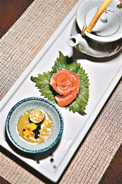 秋季漸涼,一碗暖湯沁心房。松茸亦是日本常食之物,Tommy用松茸配木魚花、老雞、瘦肉、魷魚干、蝦和吞拿魚魚背肉,加百合、銀杏、蛤蜊一起做湯,濃縮成精華。這湯頗有創(chuàng)意,裝于功夫茶壺中,沏于淺杯內(nèi),杯中置小金橘片,一旁小碟放吞拿魚,先飲一口湯,再夾吞拿魚在湯中燙一下,表層微熟,里頭軟嫩,吃魚再飲湯,味道又有別于前。日本人吃魚,喜歡有所配搭。比如吃烤魚配姜芽,吃壽司配壽司姜,刺身魚則有時(shí)配芥末豉油有時(shí)配檸檬或者金橘,湯中會(huì)加檸檬以去腥。這也就是為什么師傅在湯碗之中放置了一片小金橘的緣由。(廣州日報(bào) 全媒體記者曾繁瑩)