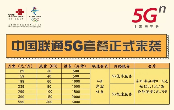 中國聯(lián)通的套餐有7個(gè)檔次。最低檔為每月129元(30GB+500分鐘通話),最高檔次為每月599元(300GB+3000分鐘通話)。