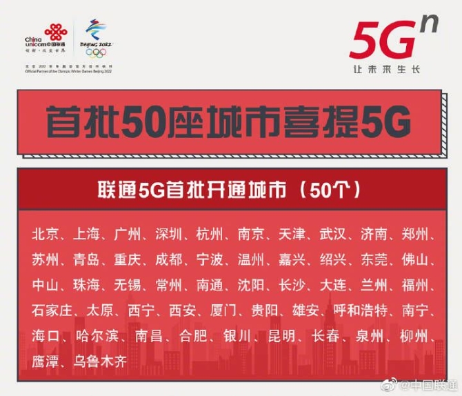 中國移動(dòng)首批50個(gè)5G商用城市:北京、天津、上海、重慶、石家莊、雄安、太原、晉城、呼和浩特、沈陽、大連、長春、哈爾濱、南京、無錫、蘇州、杭州、寧波、溫州、嘉興、合肥、蕪湖、福州、廈門、泉州、南昌、鷹潭、濟(jì)南、青島、鄭州、南陽、武漢、長沙、株洲、廣州、深圳、佛山、東莞、柳州、南寧、海口、瓊海、成都、貴陽、昆明、西安、蘭州、西寧、銀川、烏魯木齊。