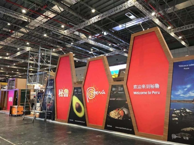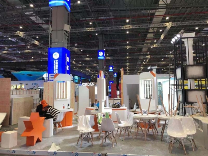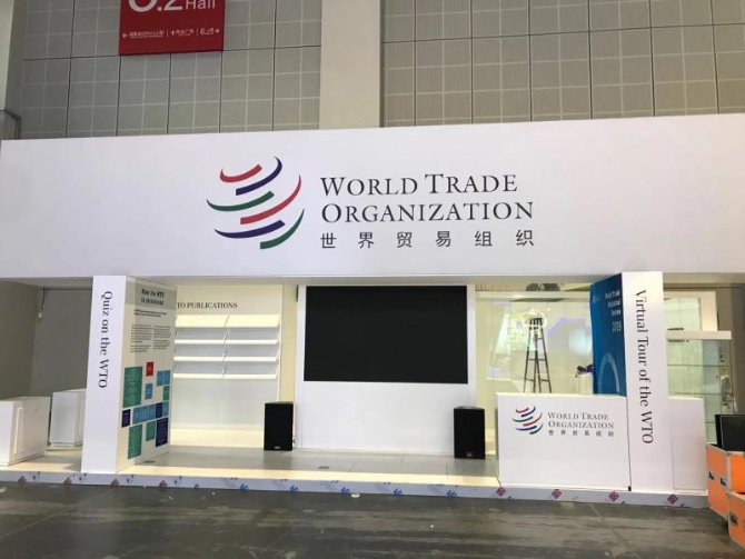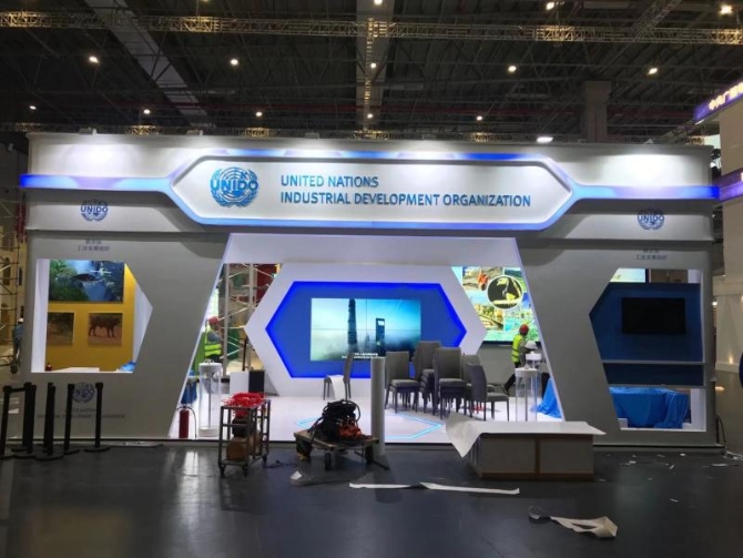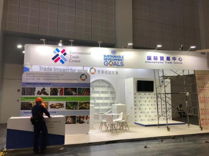 從5.2號館01號門進入展館,最先映入眼簾的是國際貿(mào)易中心、世界貿(mào)易組織和聯(lián)合國工業(yè)發(fā)展組織這三大國際組織的展臺。以白色為主色調(diào)的三大國際組織展臺,已完成基礎(chǔ)搭建工作,正在進行裝飾和布展。
