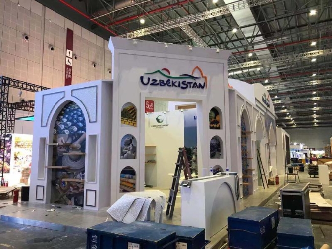 哈薩克斯坦展館內(nèi)部以哈薩克斯坦四家企業(yè)形象為背景,展現(xiàn)哈薩克斯坦人民凝心聚力共同致力于國家未來發(fā)展的美好愿景。烏茲別克斯坦展臺用12個單元,分別展示在旅游業(yè)、汽車制造業(yè)、輕工業(yè)、化工業(yè)、食品工業(yè)等領(lǐng)域所取得的發(fā)展成就,并將詳細推介最新的投資項目。