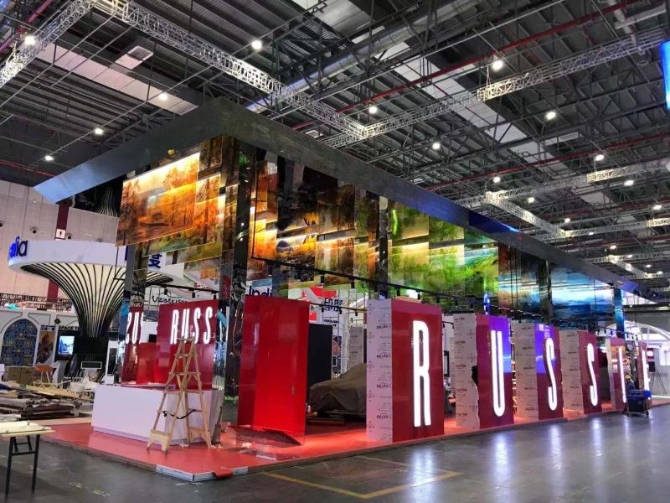 坐落于縱橫兩條主通道的路口,俄羅斯大大的“RUSSIA”字樣非常醒目。在展會期間,參觀者可以欣賞到俄羅斯的音樂佳作,感受令人心曠神怡的自然風(fēng)光,了解最先進的科學(xué)技術(shù)成果,體會斯拉夫民族的社會文化生活。
