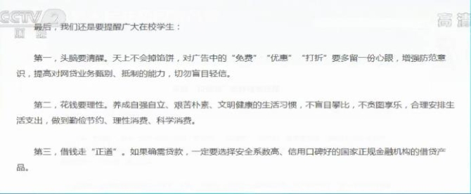 央視網(wǎng)消息:近年來,在有關(guān)部門的聯(lián)合治理下,不良“校園貸”得到了一定程度治理。但嚴(yán)防嚴(yán)治下,部分不法機(jī)構(gòu)在暴利誘惑下鋌而走險(xiǎn),仍有一些學(xué)生上當(dāng)受騙,嚴(yán)重侵犯了學(xué)生的合法權(quán)益,造成了不良的社會(huì)影響。