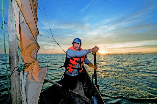 10月22日,漁民李培光在船尾掌舵,身后的太陽剛剛升起。