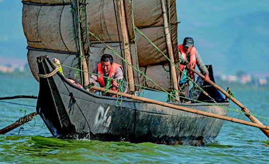 從10月16日起,滇池進(jìn)入持續(xù)30天的開湖季。為了保護滇池、減少排放,當(dāng)?shù)貪O民早已不再使用燃油機動船出湖捕魚,取而代之的是一種傳統(tǒng)的三桅帆船。眼下正是滇池一年中最適合捕魚的季節(jié),趕上風(fēng)力適合的天氣,劃出港灣的漁船揚起風(fēng)帆就能乘風(fēng)入湖,撒開網(wǎng)就能順風(fēng)捕魚。