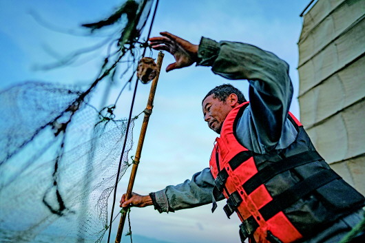 漁民張開弟在廚房里扒了兩口飯,便與妻弟李培光急匆匆地趕往碼頭,開始一天的捕魚勞作。