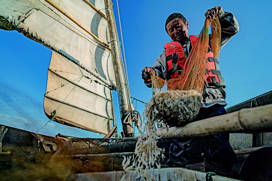 10月22日,漁民張開弟(右)撒下當(dāng)天的第一網(wǎng)。