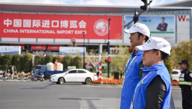 首屆進(jìn)博會期間,徐涇鎮(zhèn)800多名“微笑四葉草”在崗位上默默付出。