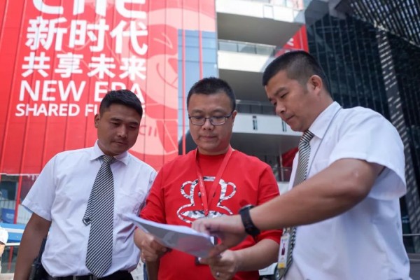 圖說:首屆進(jìn)博會(huì)前,國(guó)家會(huì)展中心安保部員工正在協(xié)調(diào)安保部署