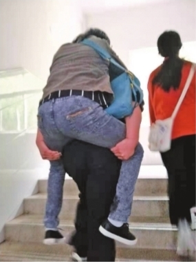 “大概是早上8時30分,我們看到她拄著拐杖,她媽媽在旁邊攙扶。我們趕緊過去問了一下具體情況?!蔽洳砉W院教師劉明楊說,因為她的考室在3樓,就安排了一位老師把她背上去,上午考完試后,又把她背下來。