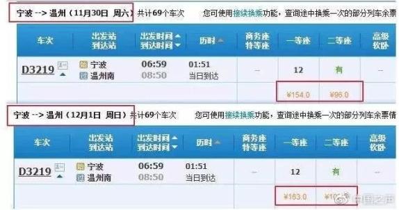 然而,票價也并不是都處于降價趨勢,對于部分列車段而言,票價也出現(xiàn)了上升的情況。以寧波開往溫州的G2343次列車為例,11月30日,該車的商務(wù)座288元,一等座154元,二等座96元;而12月1日,該車的票價商務(wù)座、一等座、二等座分別上漲17元、9元和6元,票價出現(xiàn)了小幅上漲。
