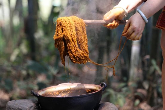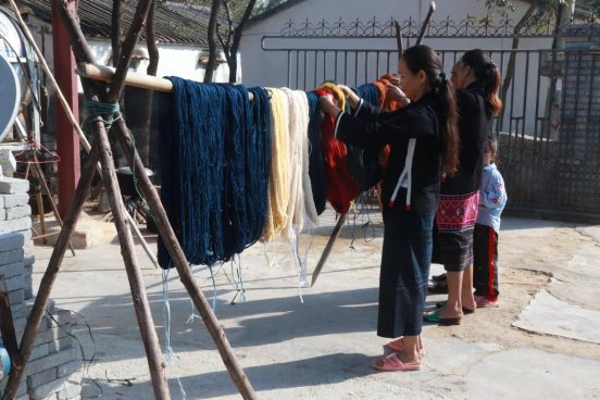 拍攝時間:2016年,拍攝地點:白沙黎錦傳習(xí)館,作者:董明玉,內(nèi)容:潤黎黎錦技藝傳承人正在染紗線