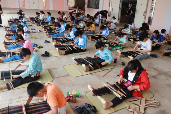 拍攝時間:2018年,拍攝地點:海南東方黎錦傳承館作者:陳科成,內(nèi)容介紹:黎錦技藝進校園教學(xué)成果展示