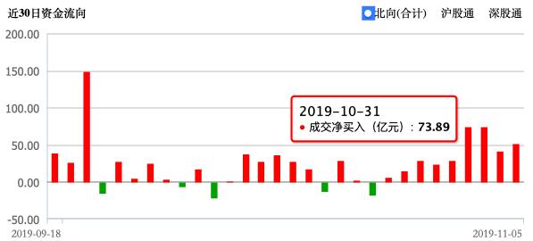Wind數(shù)據(jù)顯示,北向資金10月31日、11月1日連續(xù)凈流入73.89億元、74.49億元,較此前大幅提升。近期已連續(xù)9個交易日凈流入。