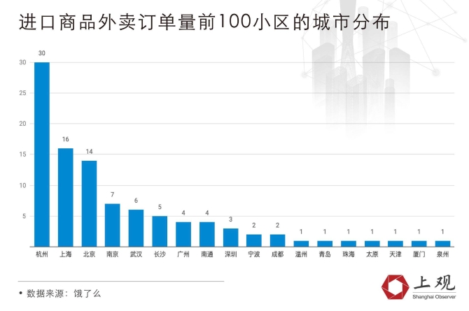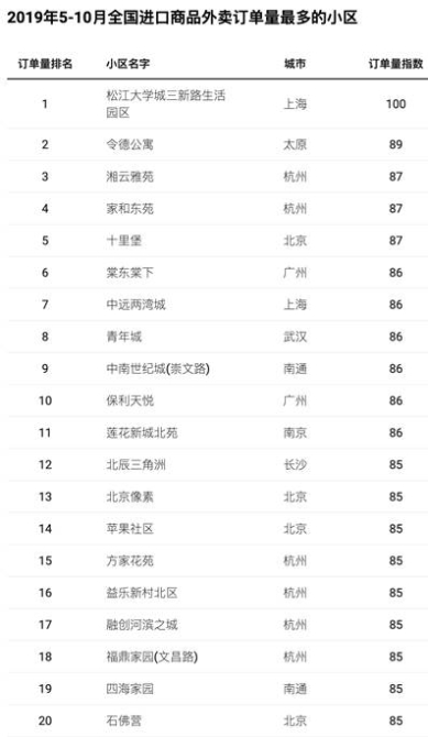 在眾多熱愛線上購(gòu)買進(jìn)口商品的居民小區(qū)中,杭州小區(qū)的數(shù)量是最多的。全國(guó)進(jìn)口商品外賣訂單量排名前100的小區(qū)中,有30個(gè)都來自杭州,其次是上海16個(gè),北京14個(gè),三座城市基本占據(jù)了高訂單量小區(qū)的半壁江山。其中,訂單數(shù)量最多的小區(qū)就在上海,是松江大學(xué)城三新路生活園區(qū)。
