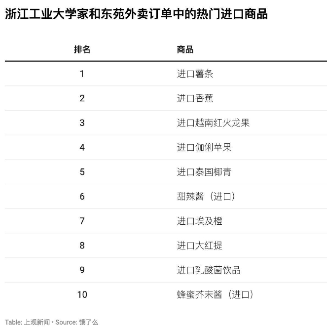 據(jù)餓了么數(shù)據(jù),小區(qū)用戶最愛買的進(jìn)口商品幾乎都是水果。排名前10的商品中有進(jìn)口香蕉、進(jìn)口提子、進(jìn)口橙子、進(jìn)口火龍果等。