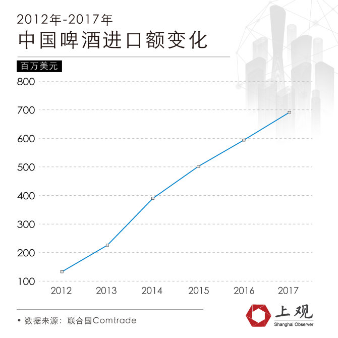 在過去幾年,中國(guó)的啤酒進(jìn)口市場(chǎng)擴(kuò)張迅速。據(jù)聯(lián)合國(guó)商品貿(mào)易數(shù)據(jù),光是2012年到2017年短短五年,啤酒的進(jìn)口額就上漲了420%。而據(jù)海關(guān)總署數(shù)據(jù),2019年截至9月,啤酒的進(jìn)口額已經(jīng)達(dá)到了6.4億美元。